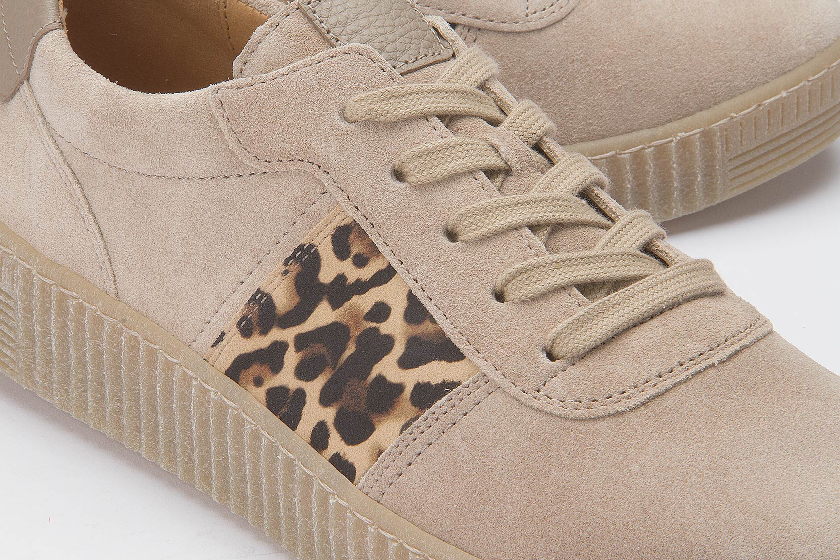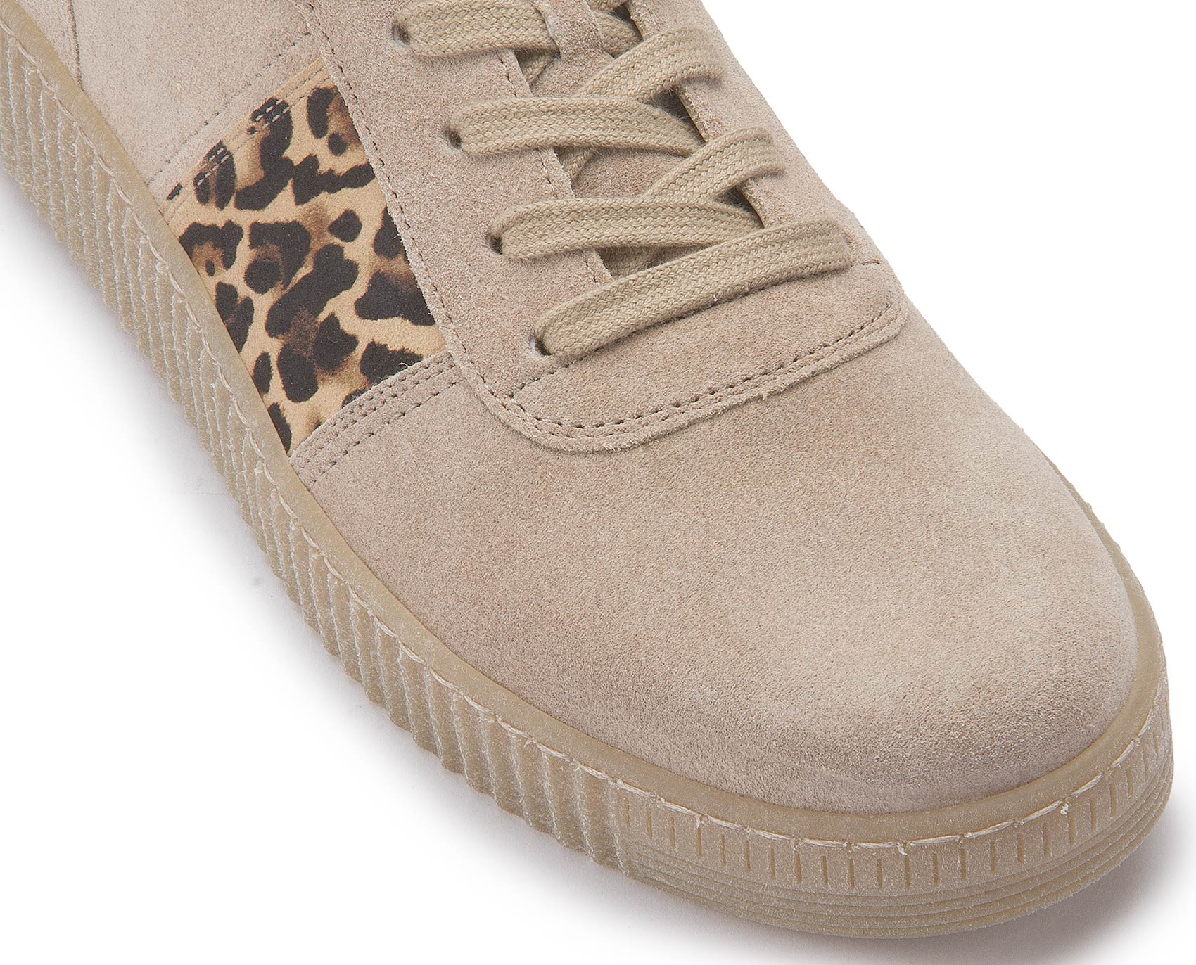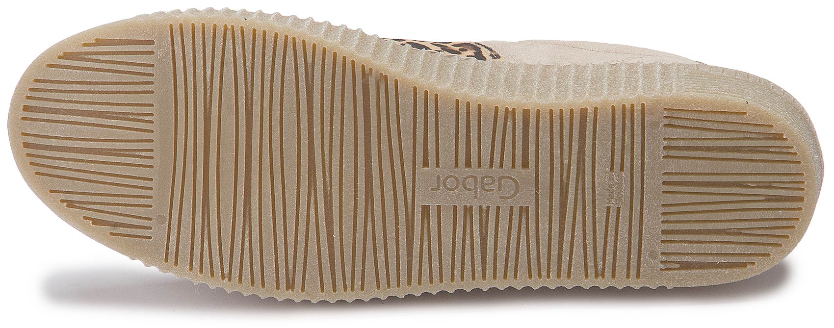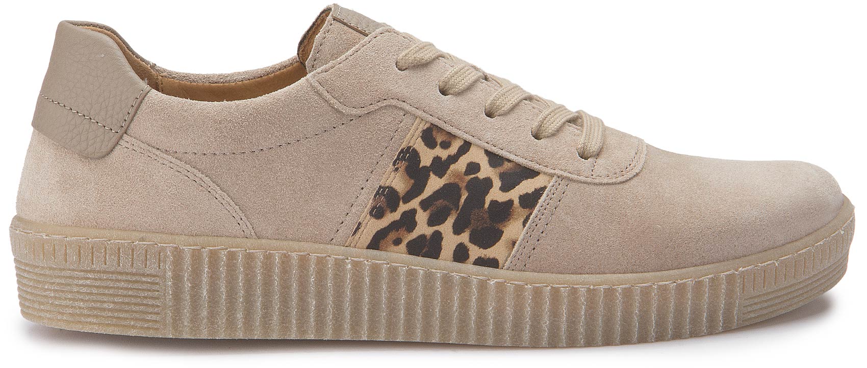 Dieser stylische Sneaker von Gabor überzeugt mit hellem beigem Rauleder, einem peppigen Leo-Detail und einer modischen Plateausohle. Er verleiht jedem Outfit einen trendigen Touch und bietet zugleich hohen Tragekomfort. Das integrierte Wechselfußbett ermöglicht die Nutzung eigener Einlagen – ideal für individuellen Komfort.