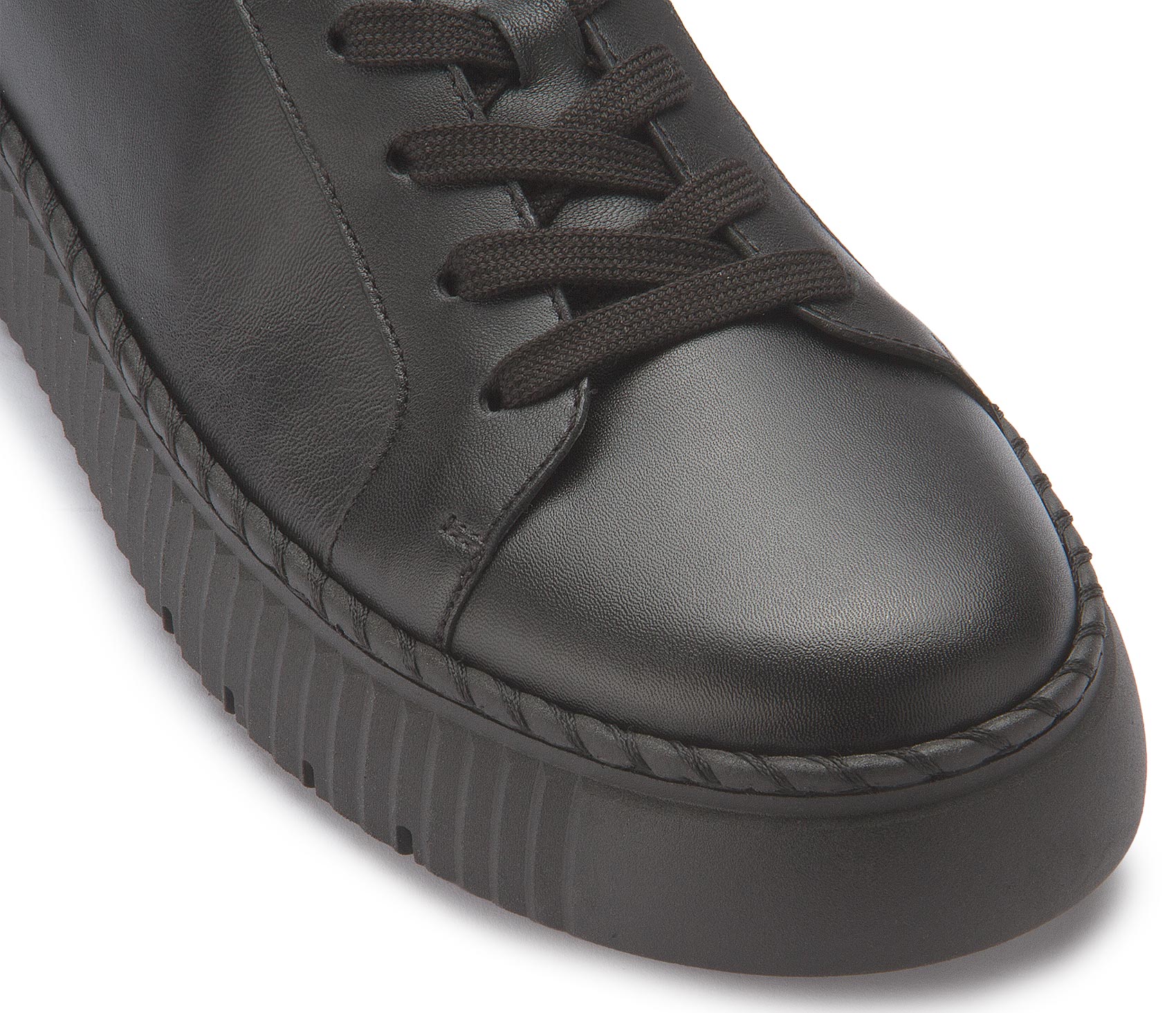Schlicht, modern und vielseitig kombinierbar – dieser schwarze Sneaker überzeugt mit seinem cleanen Design. Das glatte Leder verleiht ihm eine edle Optik, während die markante Plateausohle für einen trendigen Look sorgt. Die dezente Ziernaht rundum setzt ein stilvolles Detail. Dank der bequemen Passform ist er der perfekte Begleiter für Alltag und Freizeit