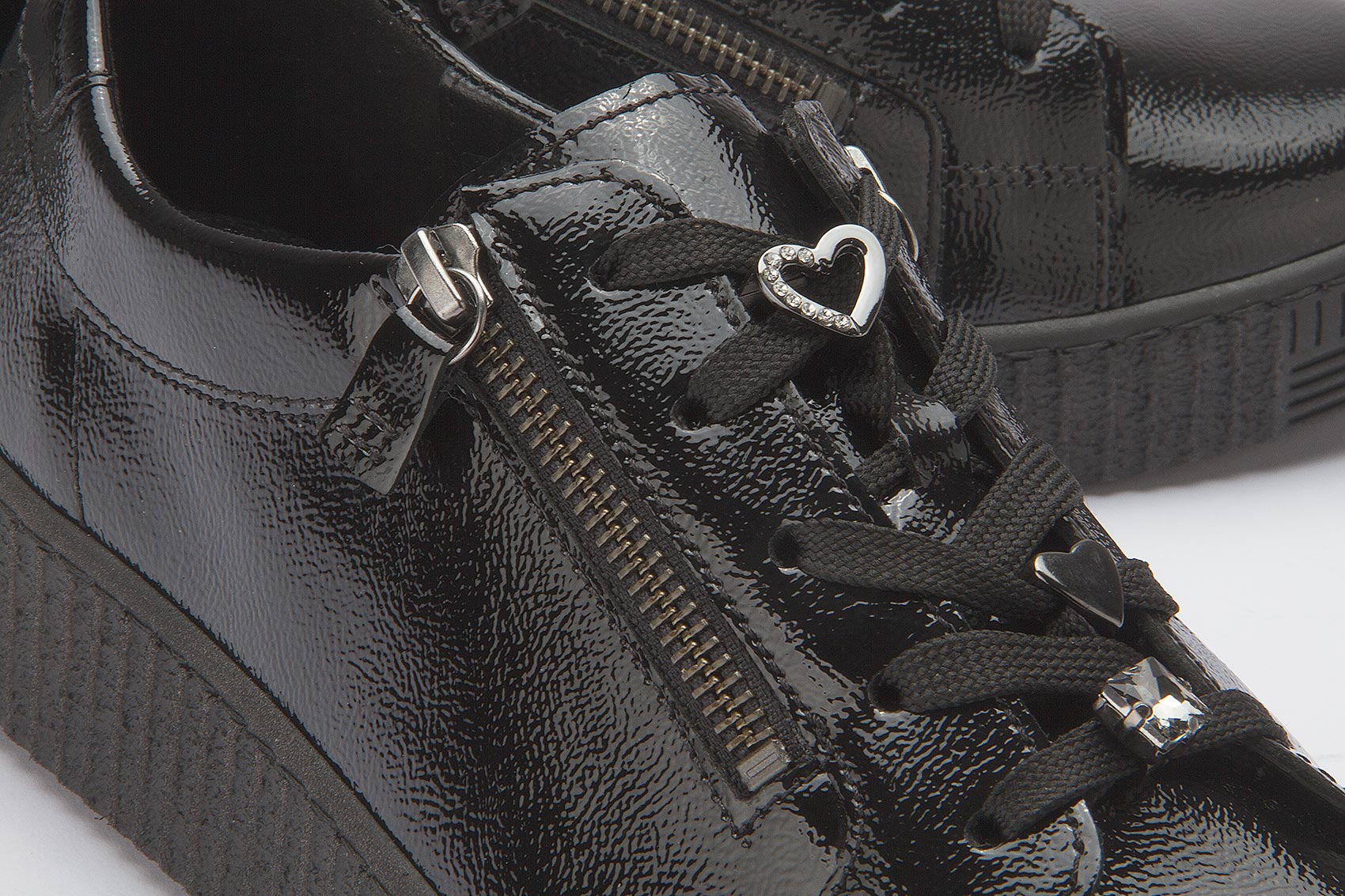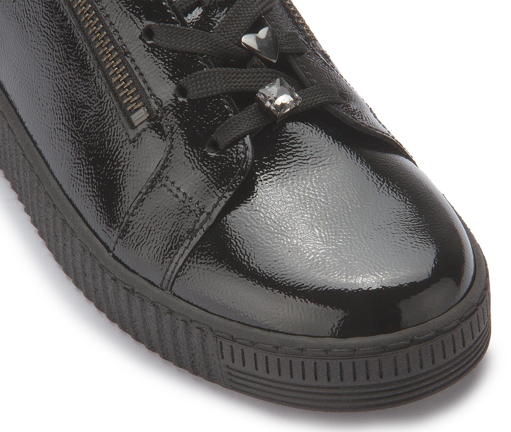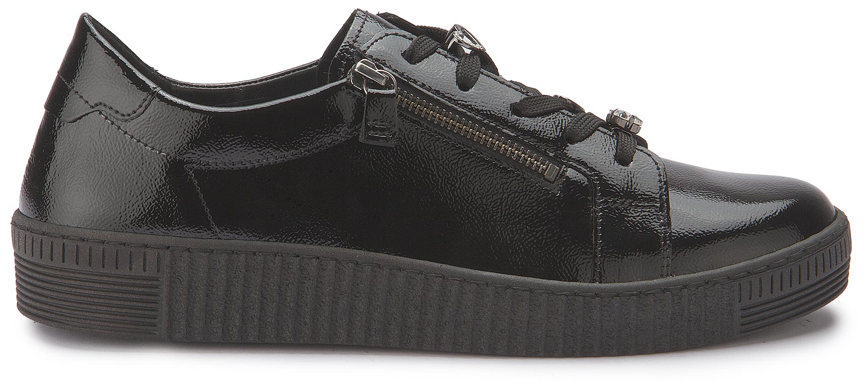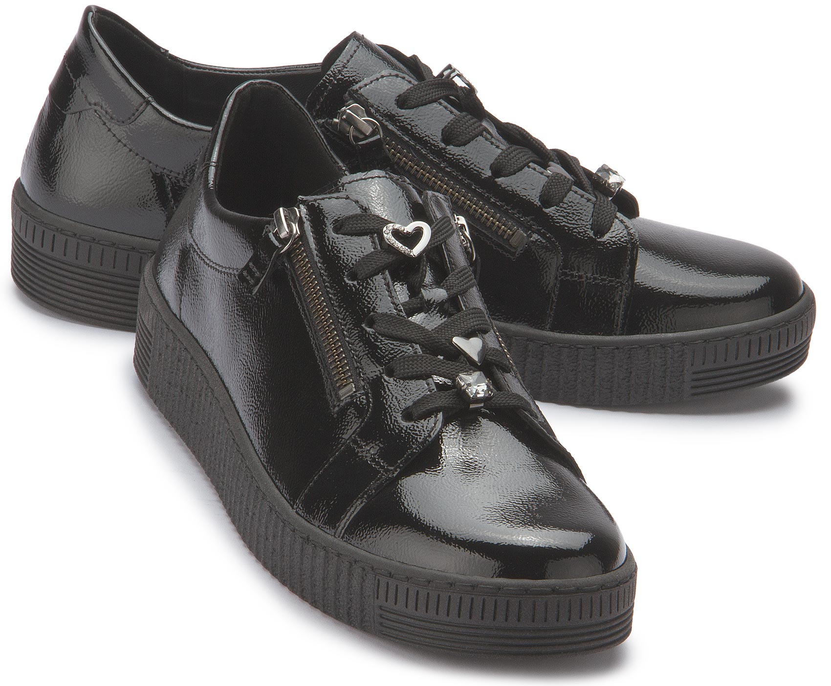 Gabor präsentiert einen trendigen Sneaker in Schwarz mit Lederfutter, Reißverschluss und runder Schuhspitze. Der Schuh vereint Stil und Komfort, ist leicht anzuziehen und bietet ein angenehmes Tragegefühl. Die abnehmbaren Schmuckelemente an der Schnürung machen den Schuh zu einem perfekten Accessoire. Zudem verfügt er über ein praktisches Wechselfußbett, das sich ideal für individuelle Einlagen eignet.