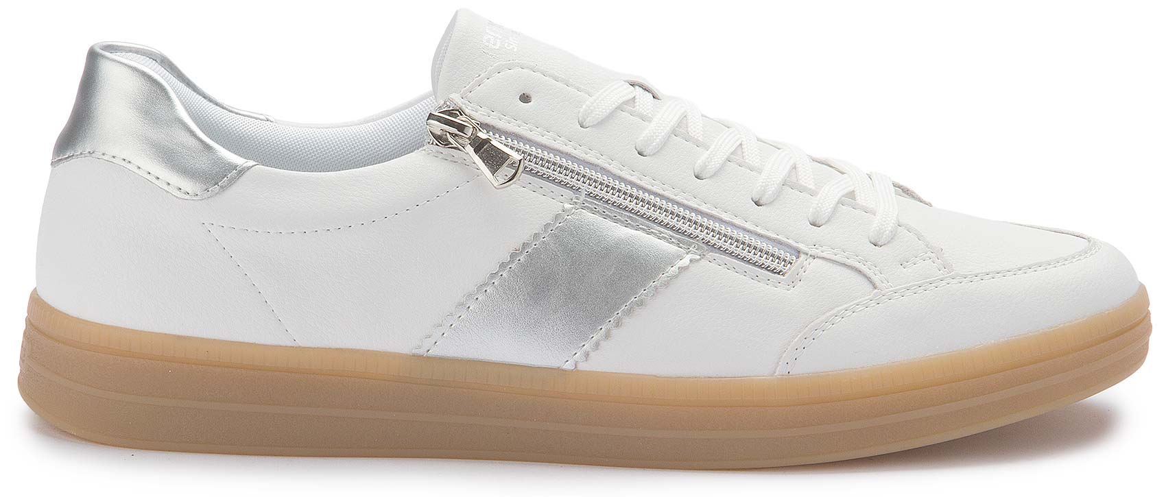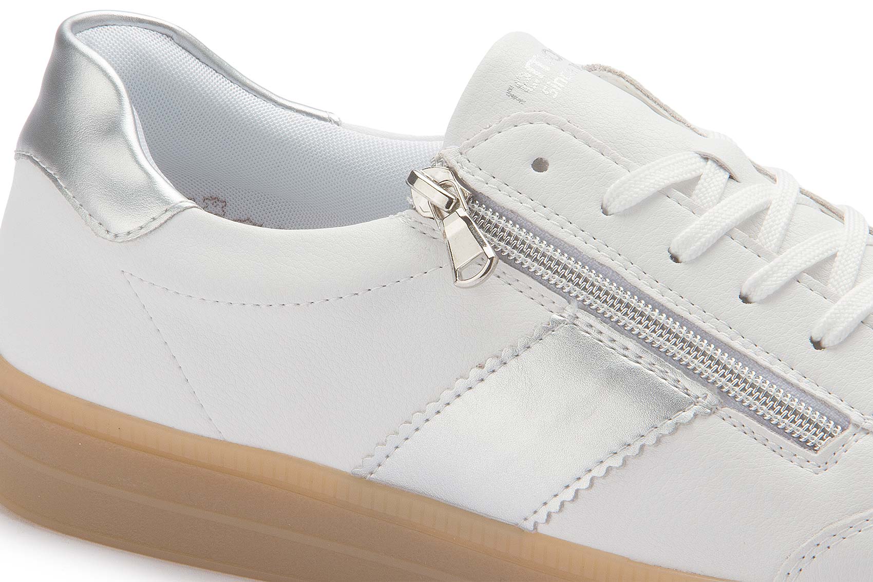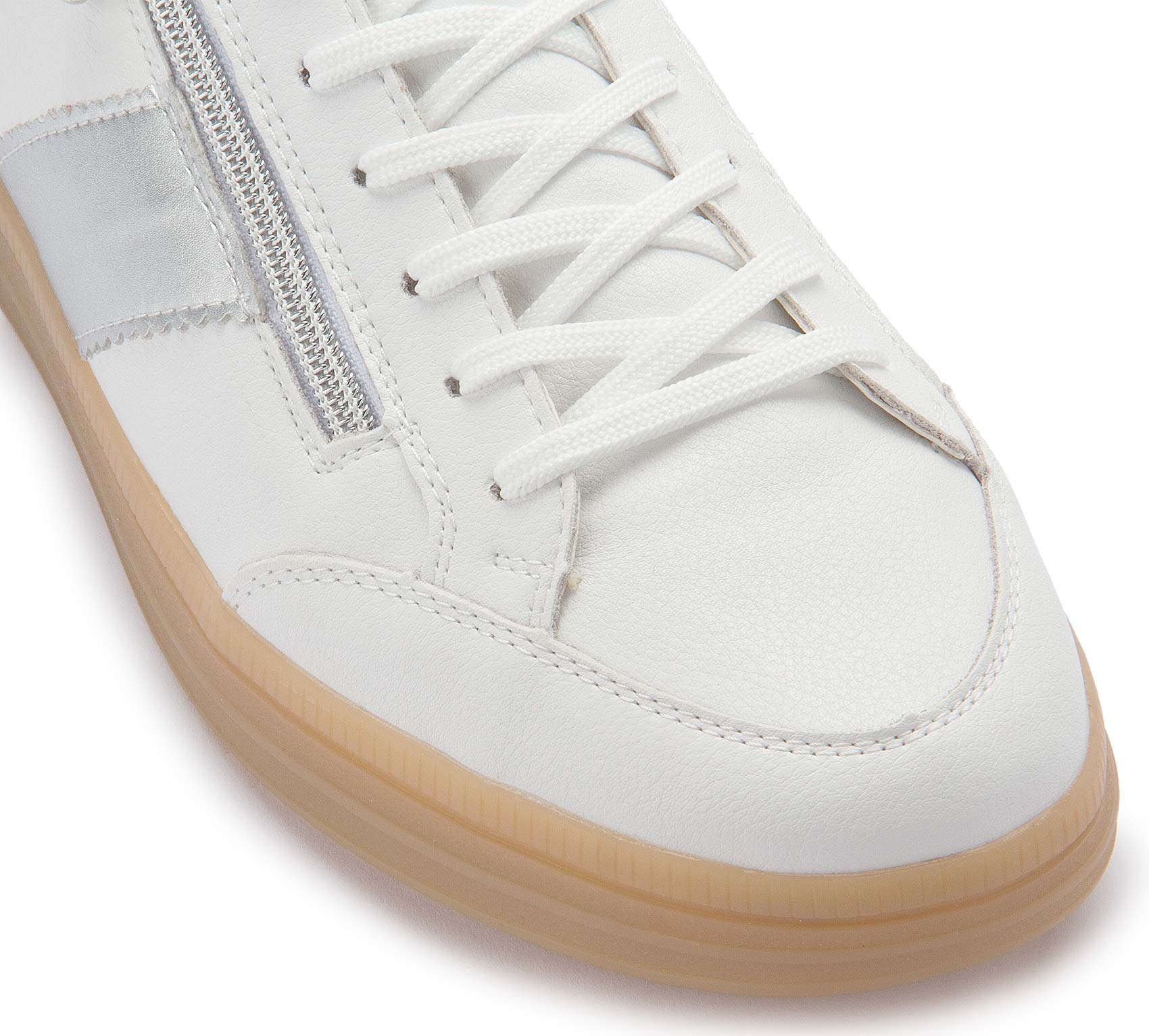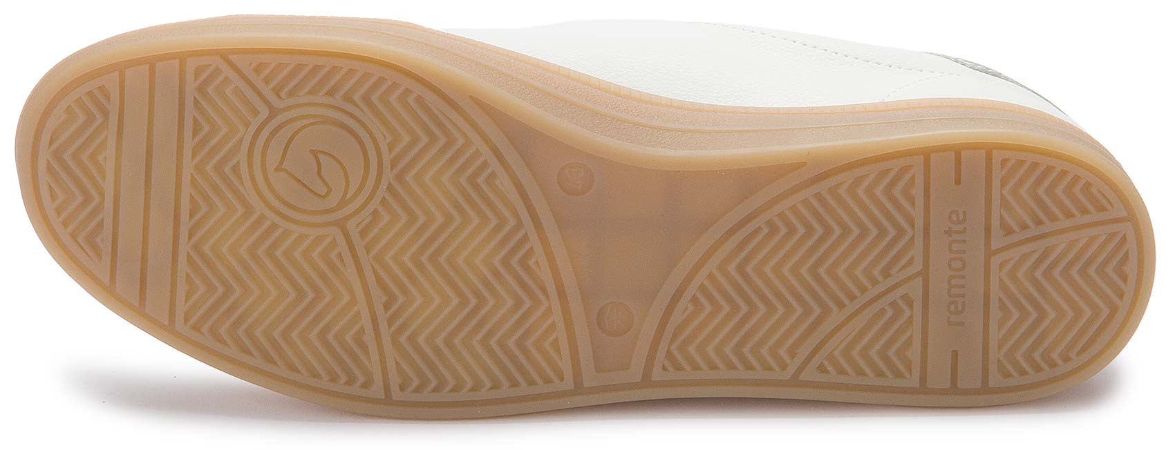 Diese weißen Remonte Sneaker aus Glattleder werden bestimmt den ein oder anderen Blick auf sich ziehen. Die clevere Kombination aus Schnürung und Reißverschluss gibt guten Halt und ermöglicht ein einfaches An- und Ausziehen. Die flexible und griffige Sohle schafft zusammen mit der gepolsterten und herausnehmbaren Einlegesohle ein Wohlgefühl bei jedem Schritt. Dieser Schuh ist in Komfortweite geschnitten. Die Innenfütterung aus atmungsaktivem Microvelour bietet lang anhaltenden Tragekomfort.