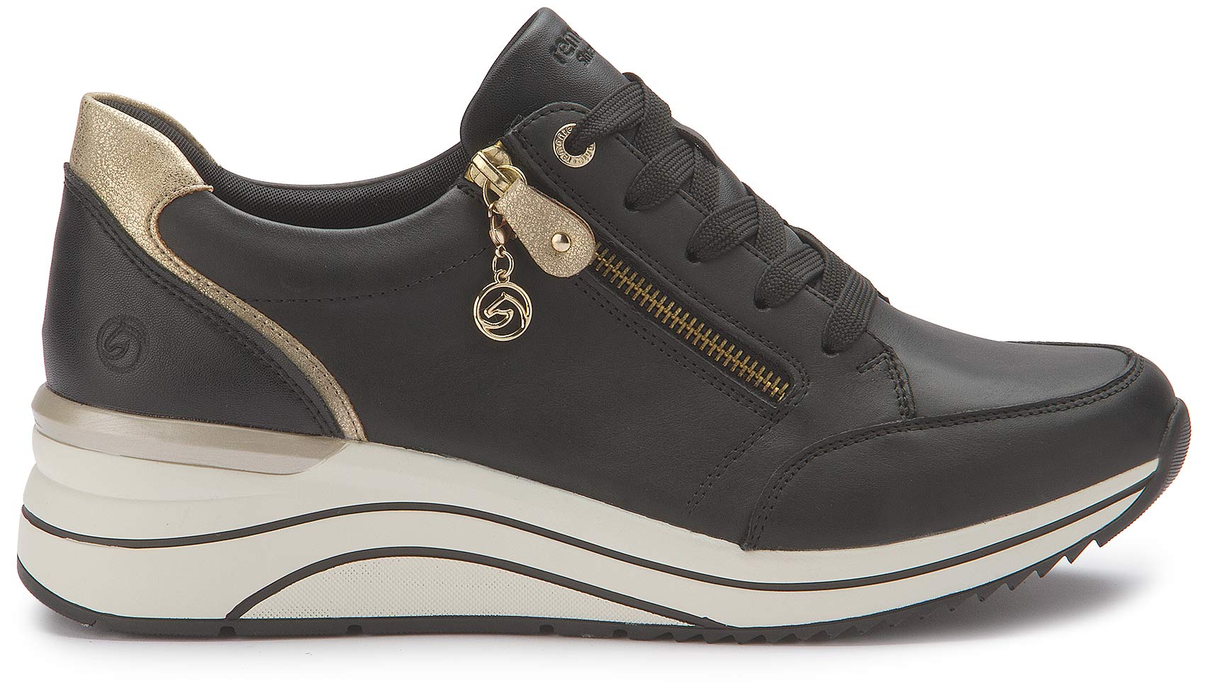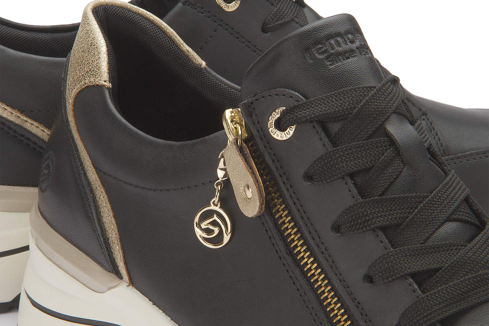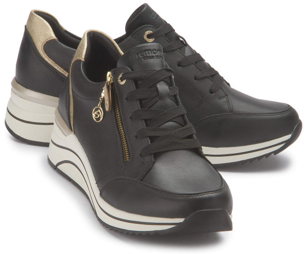 Elegant und zeitlos im Design, dennoch praktisch und komfortabel – das ist remonte by ELLE! Diese glanzschwarzen remonte Sneaker aus Glattleder wissen genau, wie Style funktioniert. Trotz Schnürung kann der Schuh ganz einfach mit einem Reißverschluss geschlossen werden. Die Lite ´n Soft Technologie kombiniert eine super leichte Sohle mit weichem Wechselfußbett. Der Schuh ist mit leichtem Microvelour gefüttert, das atmungsaktiv ist. Fashion in Bestform mit remonte by ELLE!