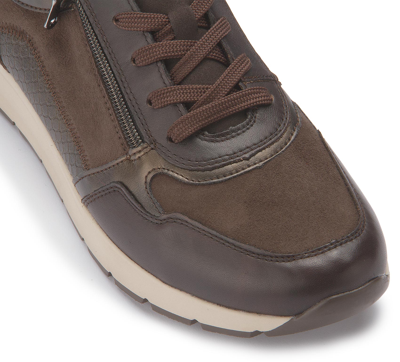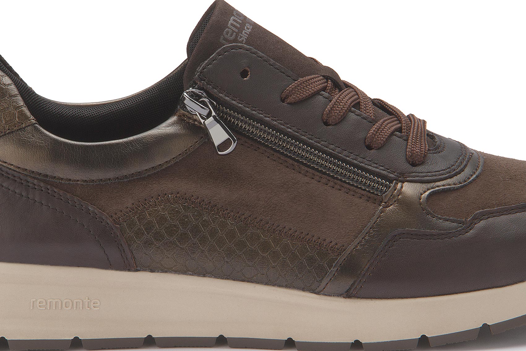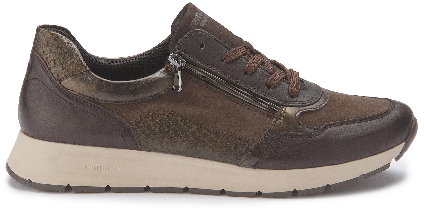 Dieser modische Sneaker von Remonte überzeugt in Braun sowie praktischen Details wie dem seitlichen Reißverschluss. Die leichte Laufsohle und das herausnehmbare gepolsterte Fußbett sorgen für angenehmen Tragekomfort – perfekt für den Alltag mit Stil