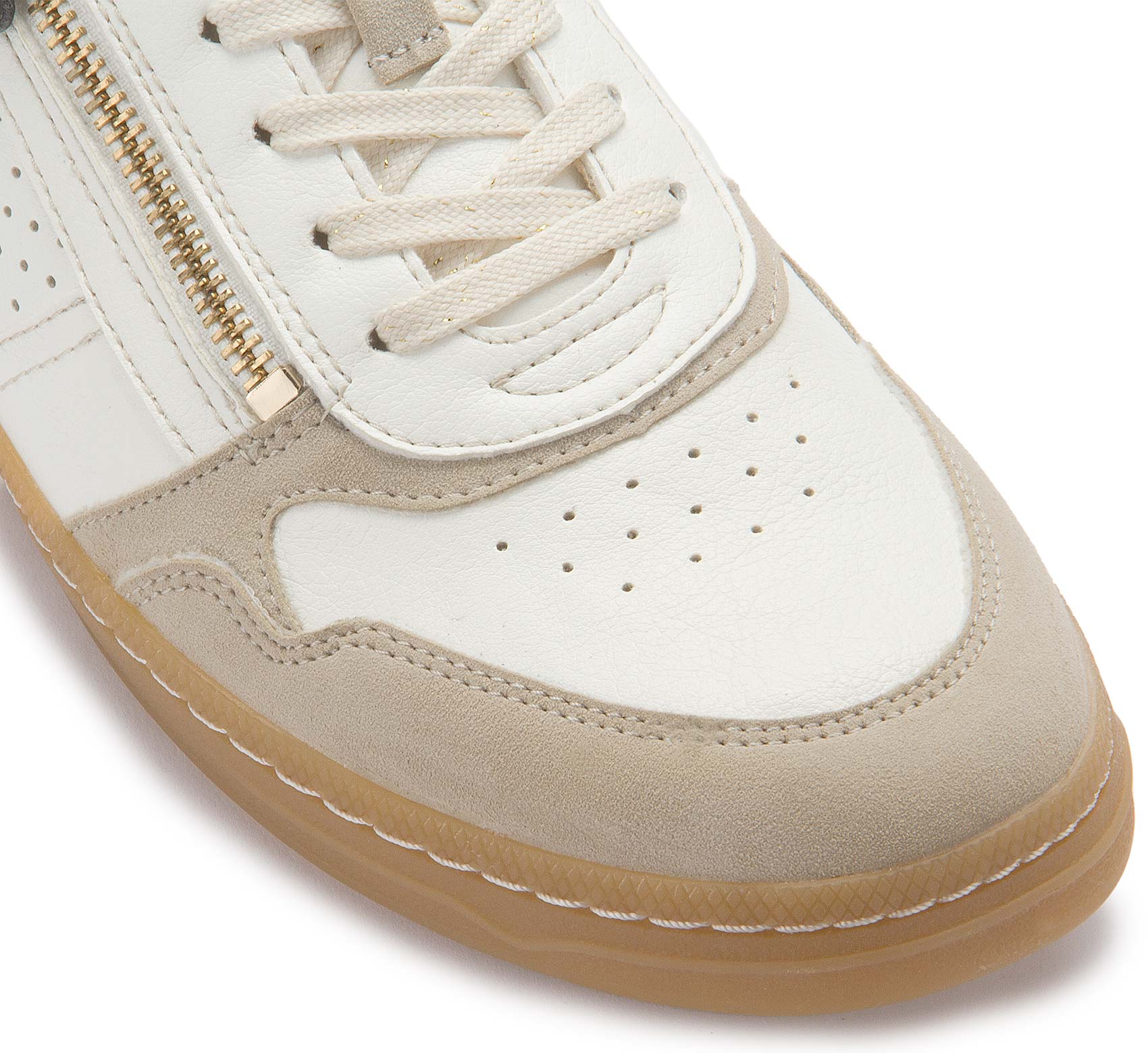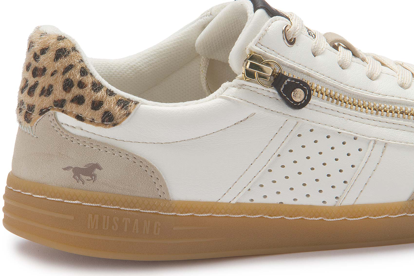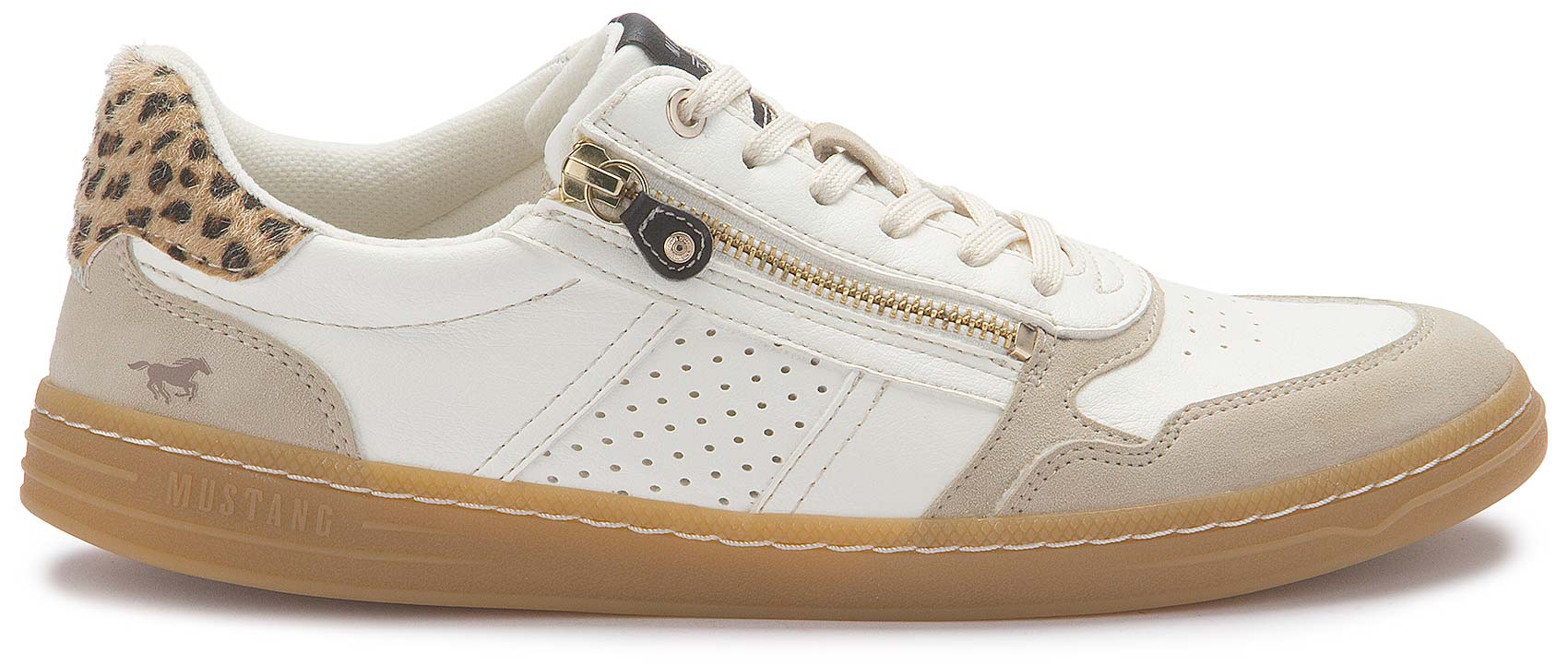 Schöner Sneaker in Weiß von Mustang aus hochwertigem Lederimitat. Die Details in Leo wirken modern. Der Reißverschluss neben der Schnürung erleichtern das Anziehen. Kombiniert zur Jeans oder zu klassisch zur Stoffhose. Dieser Sneaker von Mustang ist ein wahres Kombinationstalent!