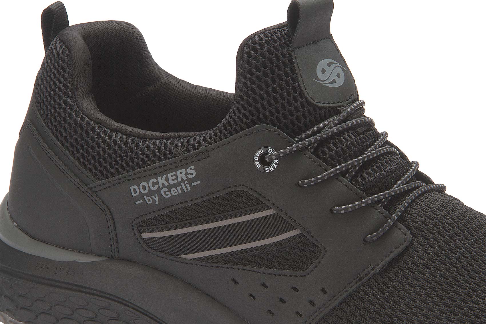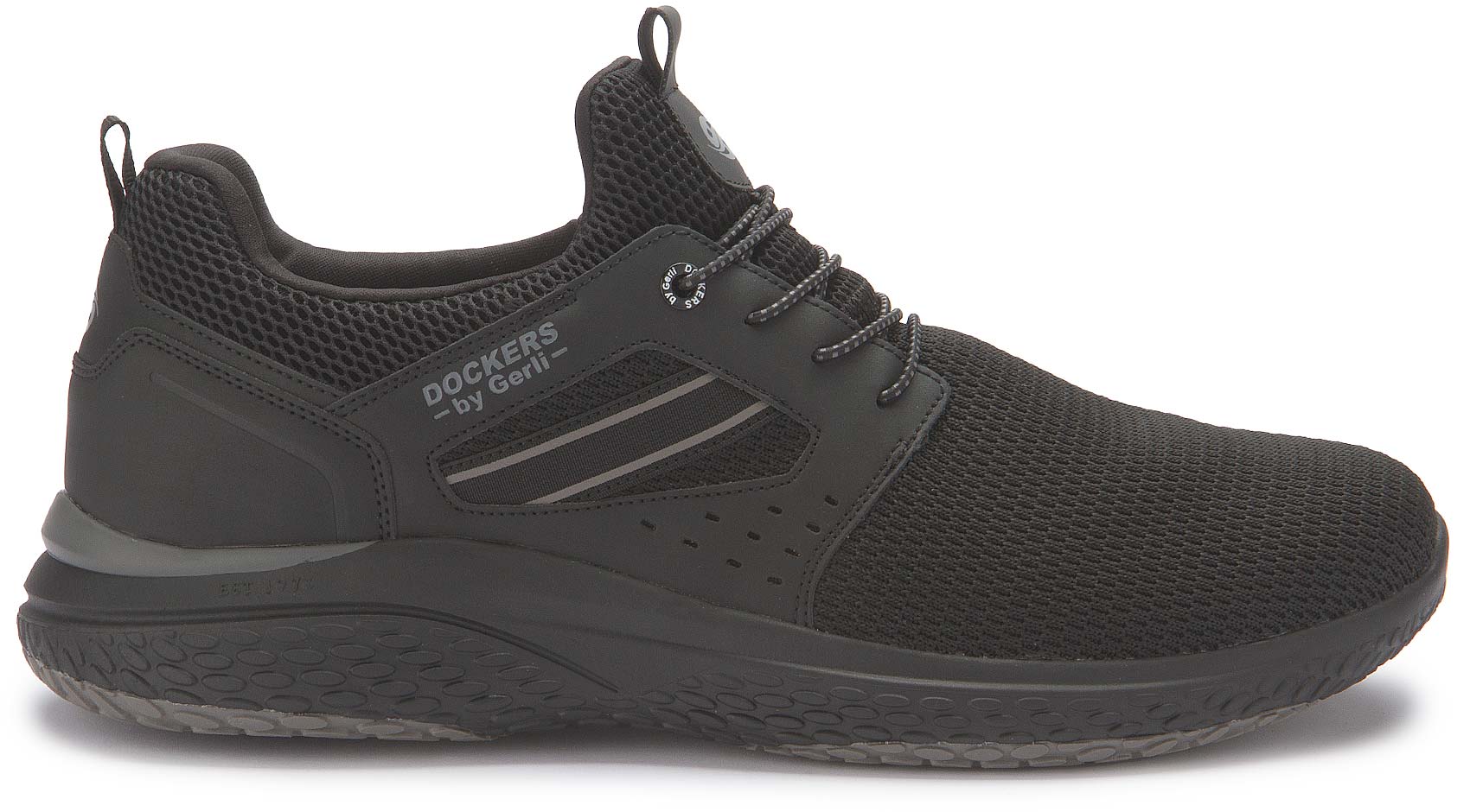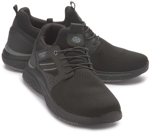 Cooler Sneaker von Dockers in Schwarz. Der Schuh besteht aus atmungsaktivem Mesh-Material und einer leichten Gummisohle. Beides garantiert tollen Laufkomfort. Weiteres Highlight sind die Schnürsenkel aus Gummi: Slipper und Sneaker in einem! Was will man mehr?