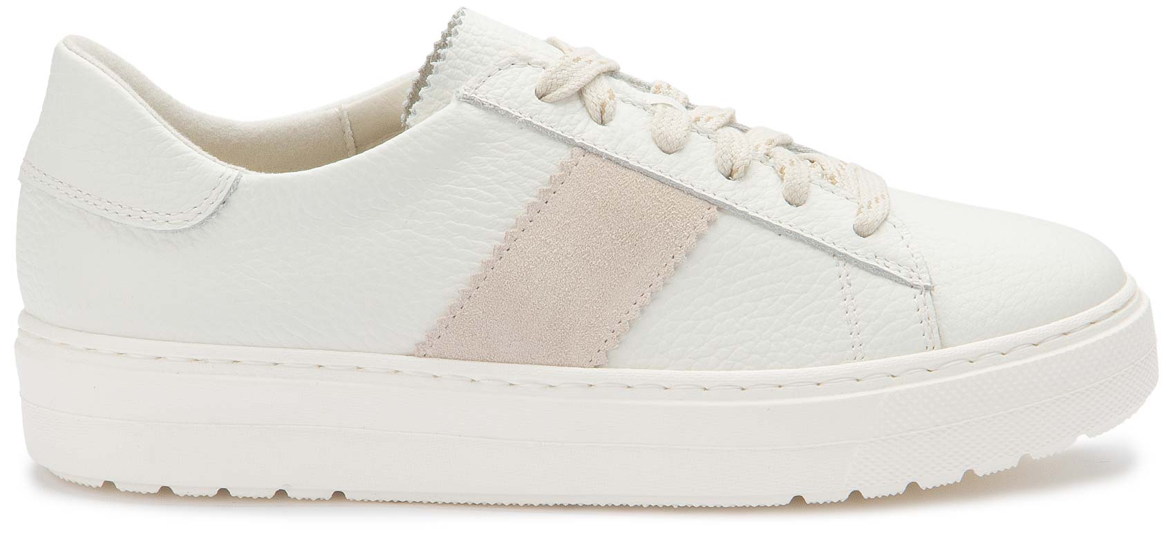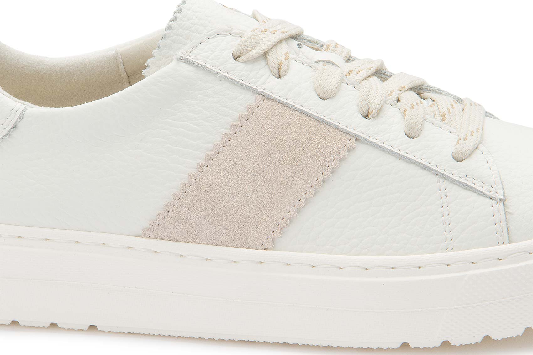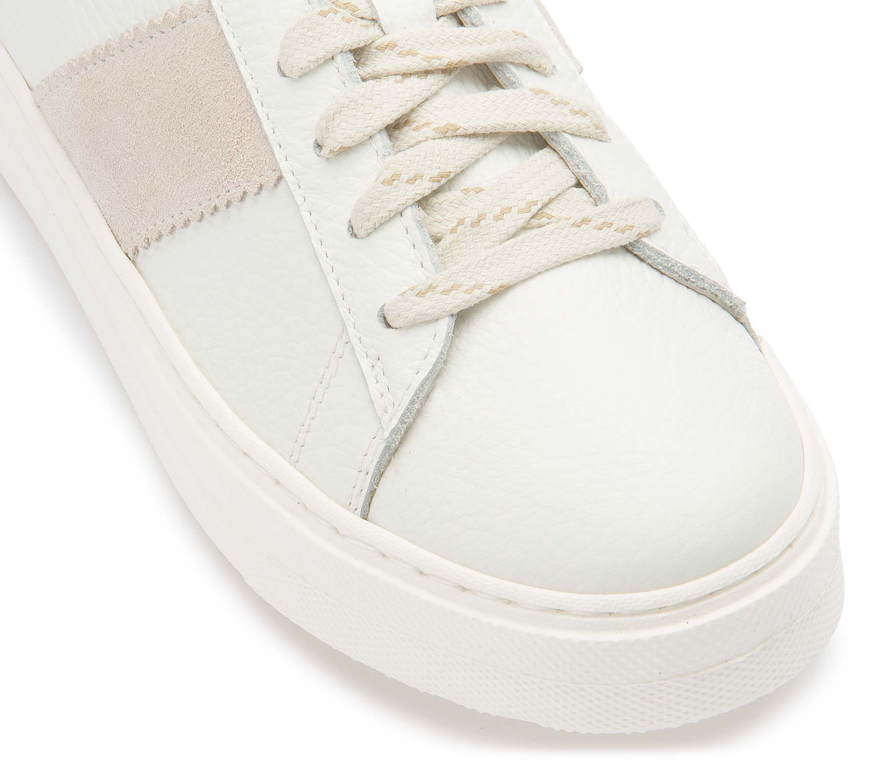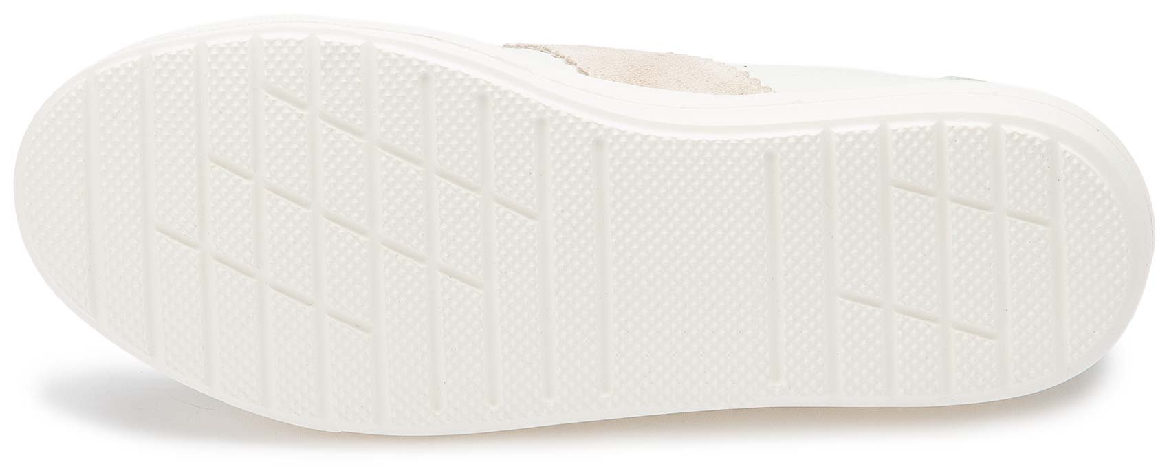 Dieser Sneaker überzeugt mit seinem modernen Look und der stilvollen Kombination aus glattem Leder und Rauleder-Details. Die dezente Farbgebung in Weiß und Beige verleiht dem Schuh eine elegante, zeitlose Ausstrahlung. Dank der komfortablen Sohle und der klassischen Schnürung ist er der perfekte Begleiter für stilvolle Alltags-Outfits.