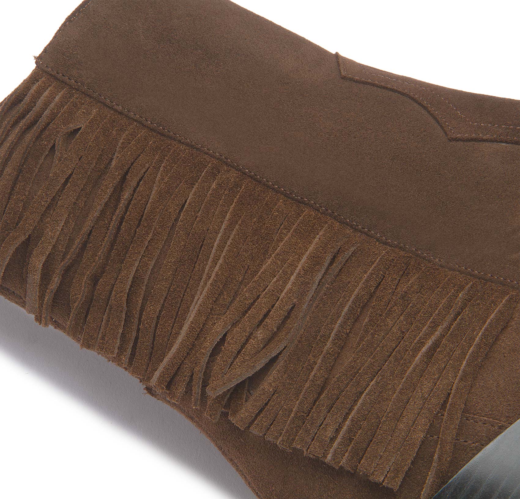 Die Stiefelette aus weichem Leder verbindet modernen Western-Charme mit femininer Raffinesse. Der seitliche Fransenbesatz und der markante Blockabsatz verleihen dem Design eine stilvolle Dynamik, während der seitliche Reißverschluss komfortables An- und Ausziehen ermöglicht. Ein vielseitiger Begleiter für modische Looks im Alltag wie am Abend.
