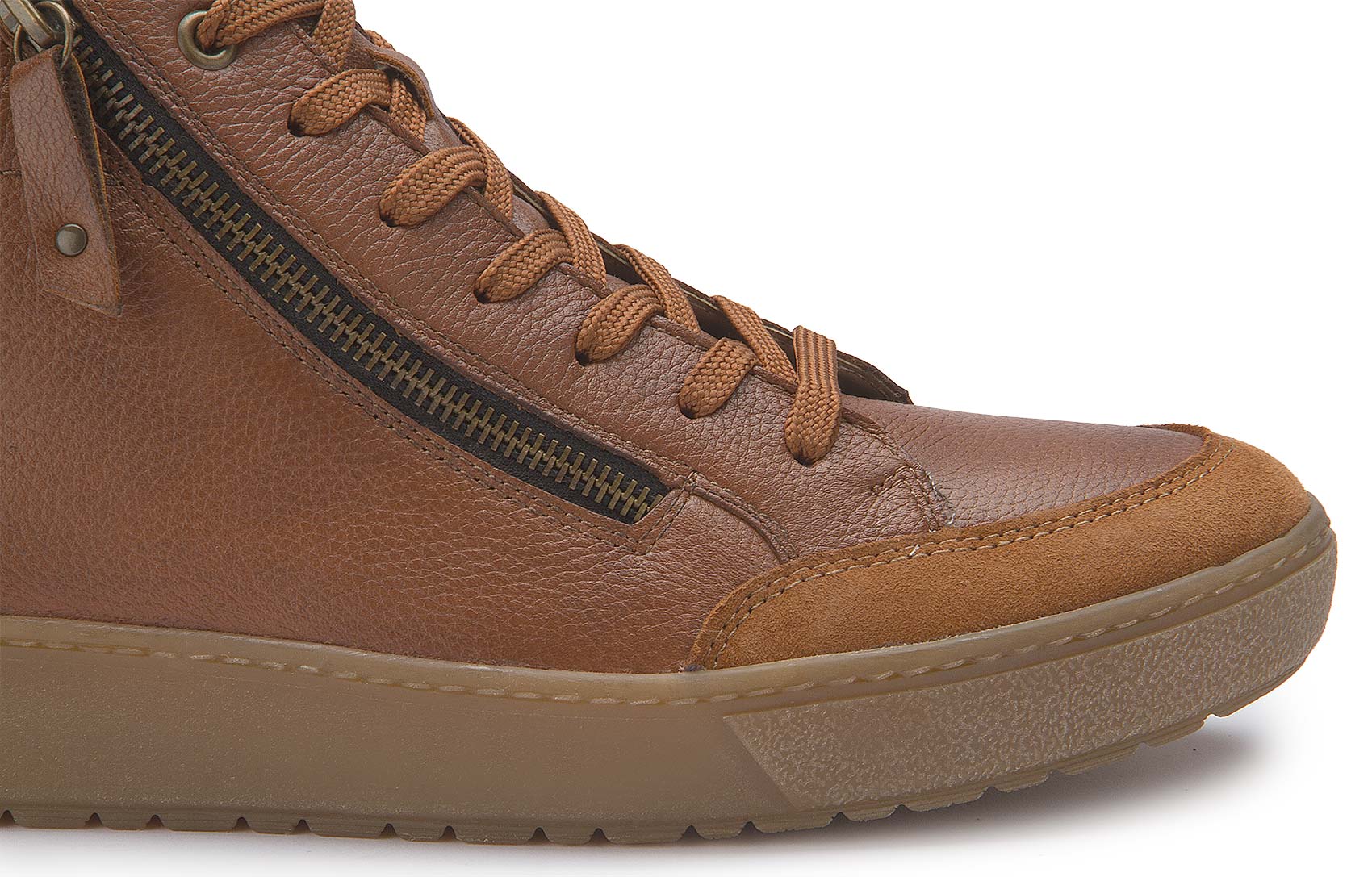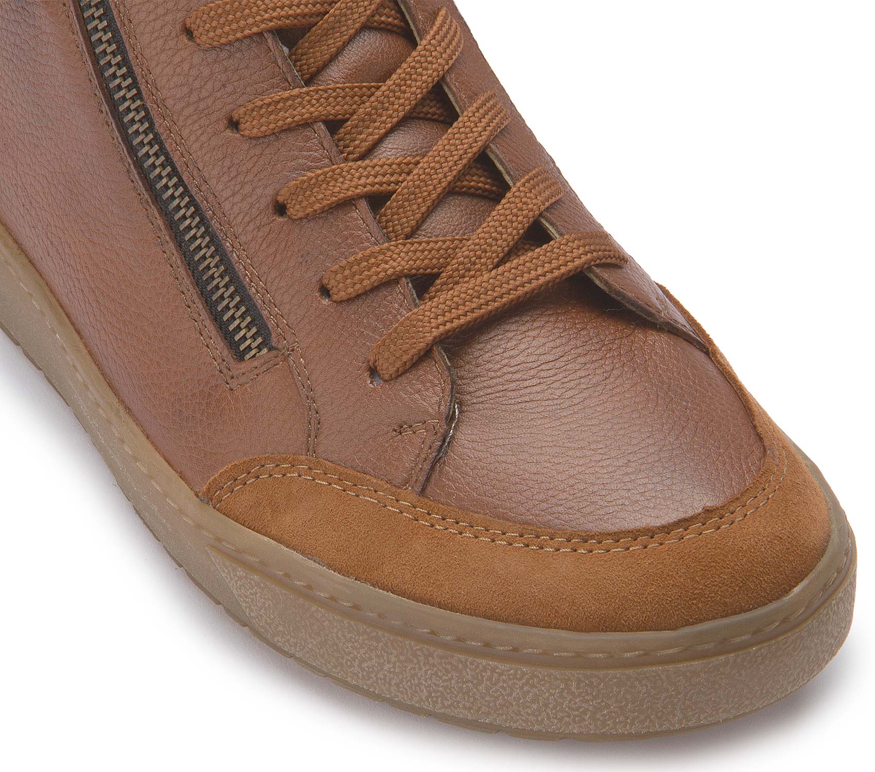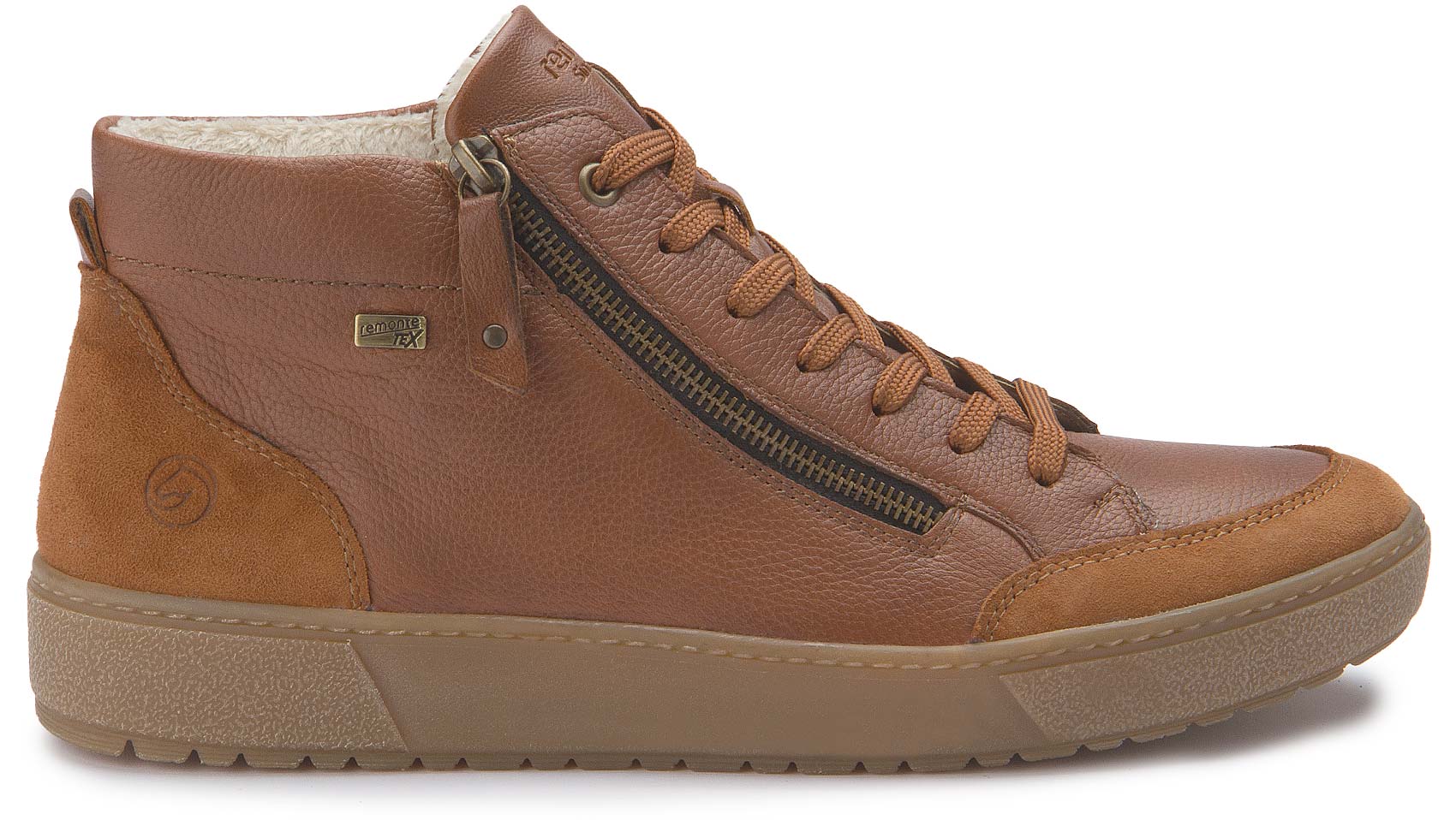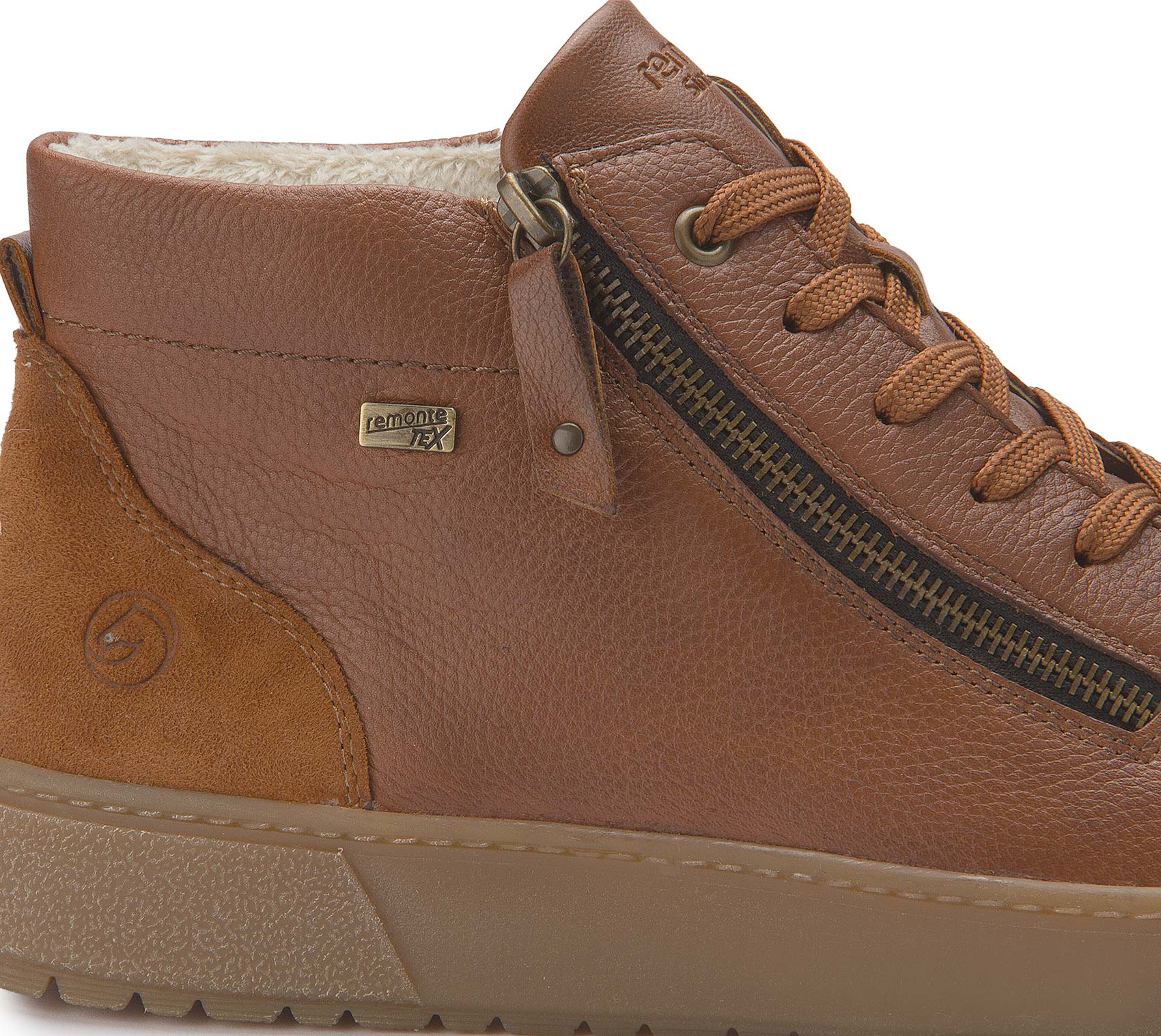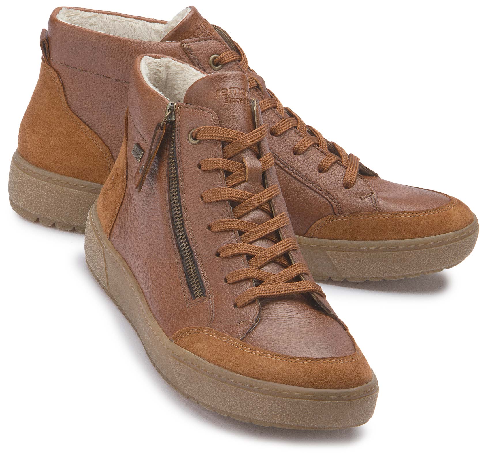 Trendbewusst! Diese braunen remonte Stiefeletten aus Glattleder sind ein wahrer Hingucker! Trotz Schnürung kann der Schuh ganz einfach mit einem Reißverschluss geschlossen werden. Eine dämpfende und griffige Sohle und die gepolsterten und herausnehmbaren Einlegesohlen sind weitere Argumente für diesen Schuh. Durch die Komfortweite haben die Füße mehr Platz im Schuh. Das wasserabweisende Obermaterial bietet optimalen Nässeschutz. Bequemer wird’s nicht mehr!