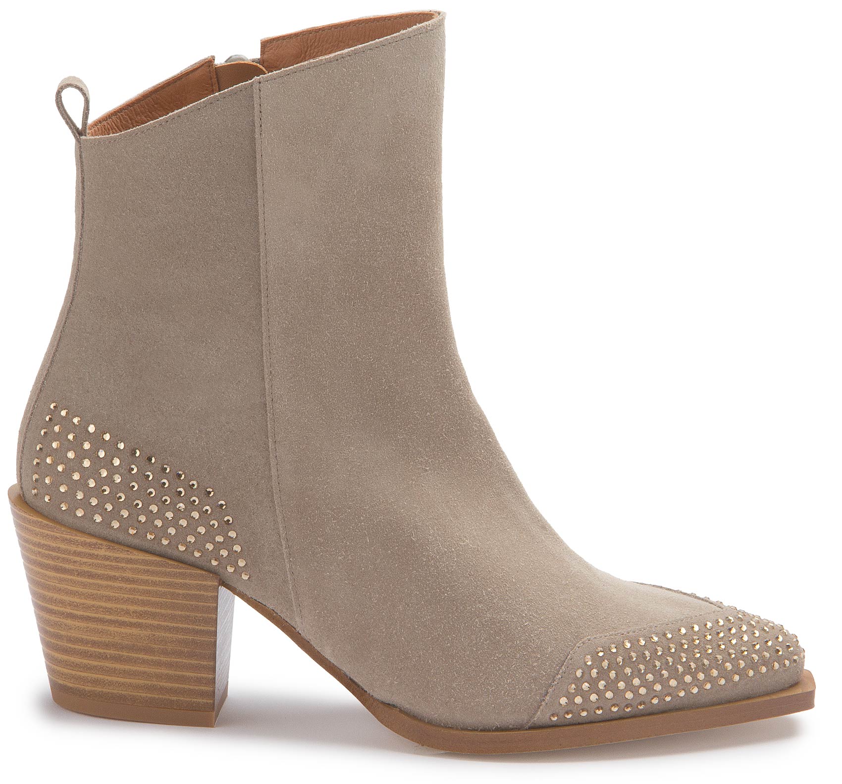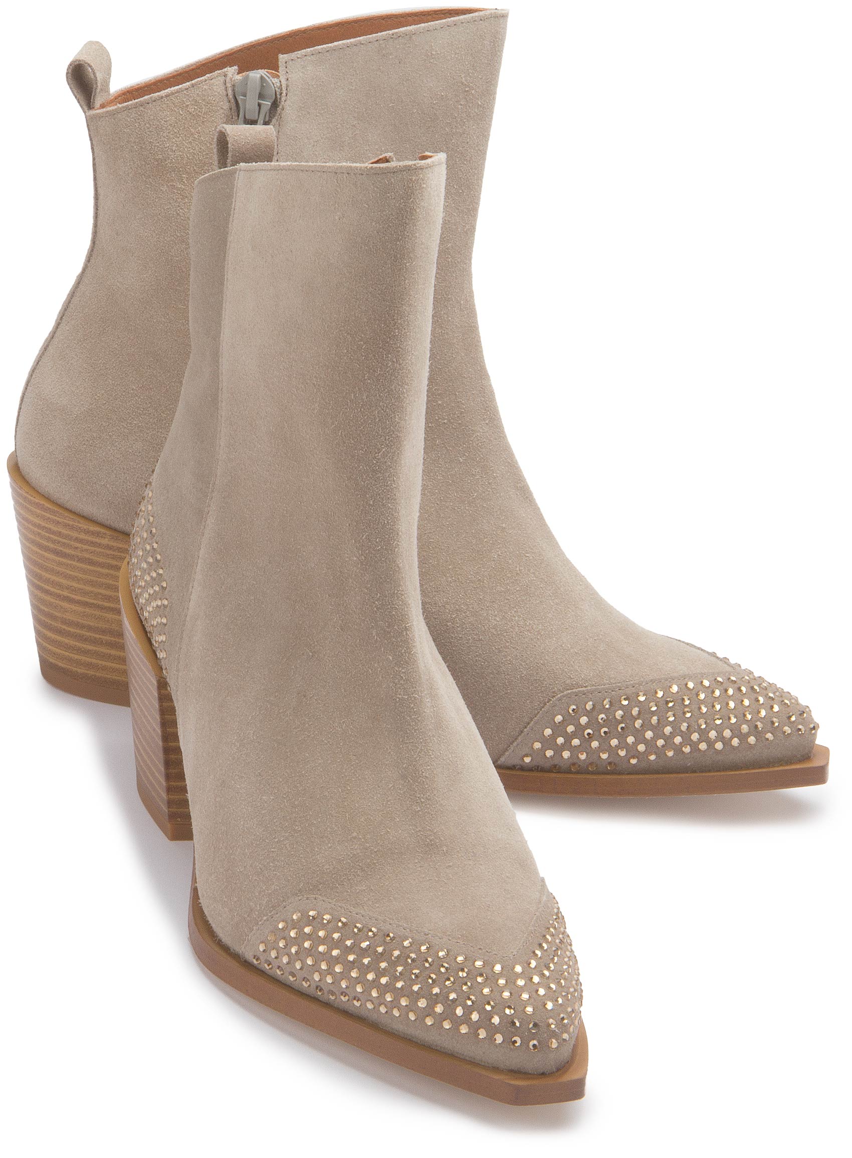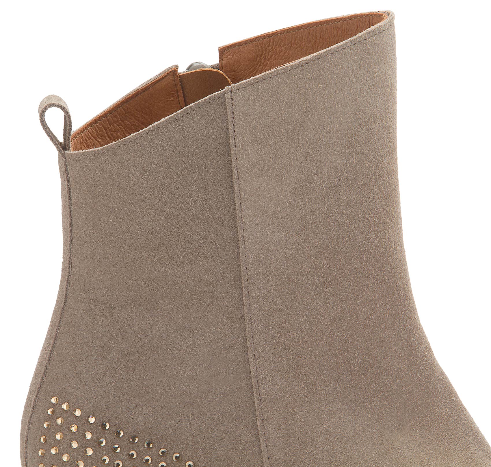 Diese edle Stiefelette von Bariello vereint luxuriöses Design mit hochwertigen Materialien. Gefertigt aus schwarzem Veloursleder und verziert mit funkelnden Steinchen an der Ferse und der Schuhkappe, wird sie zum echten Hingucker. Der stabile Blockabsatz bietet optimalen Komfort, während das Innenfutter aus Leder ein angenehmes Tragegefühl garantiert. Ein seitlicher Reißverschluss rundet das elegante Gesamtbild ab und sorgt für bequemes An- und Ausziehen.