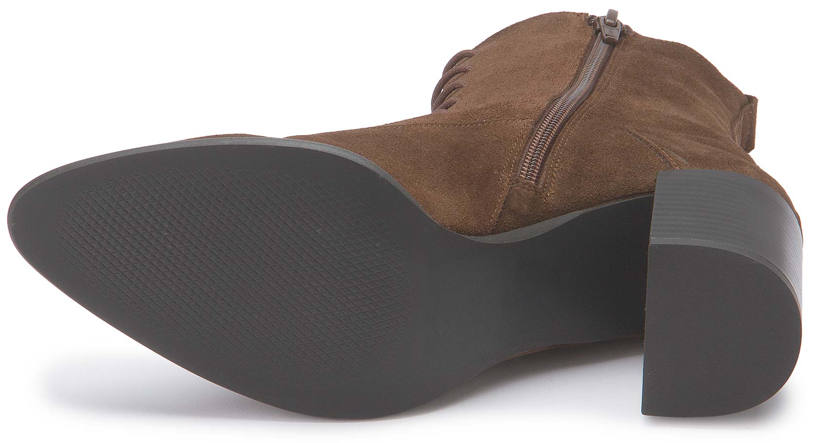 Schlicht, elegant und vielseitig kombinierbar: Diese Bariello Stiefelette aus weichem, braunem Rauleder besticht durch ihr klares Design und den bequemen Blockabsatz. Ein seitlicher Reißverschluss in Kombination mit der Schnürung ermöglicht ein unkompliziertes An- und Ausziehen und ergänzt das zeitlose Erscheinungsbild mit dezenten Akzenten.