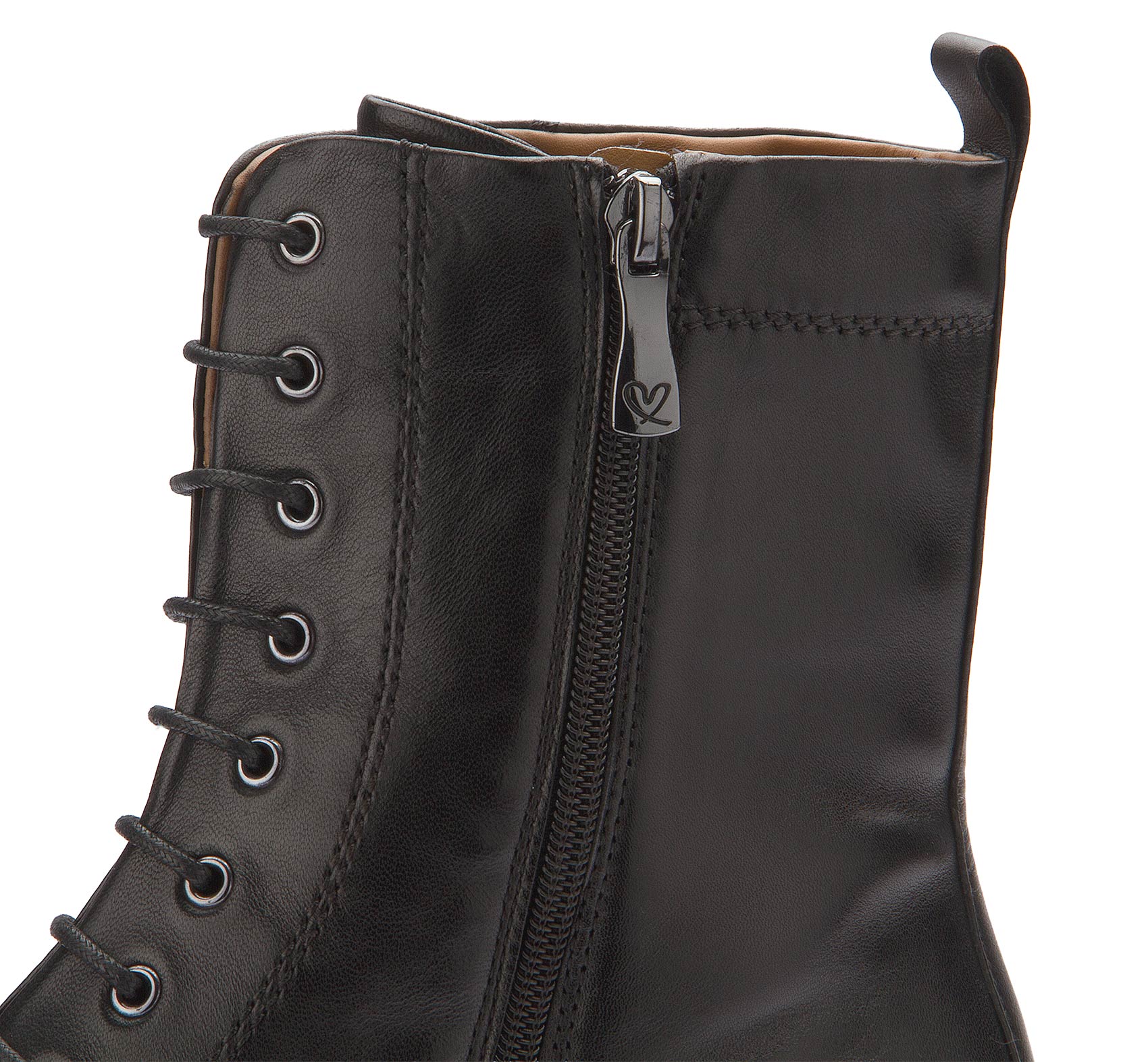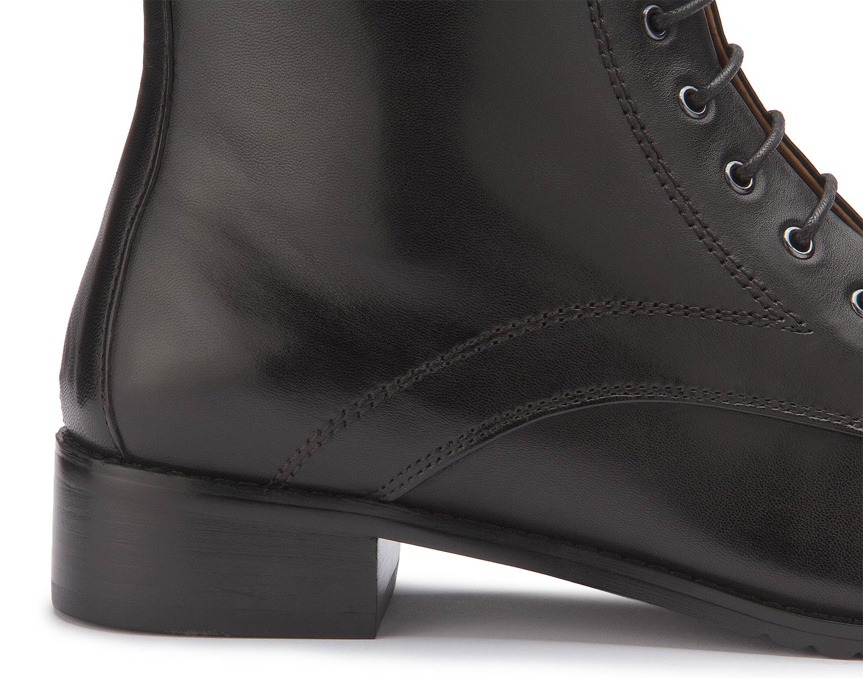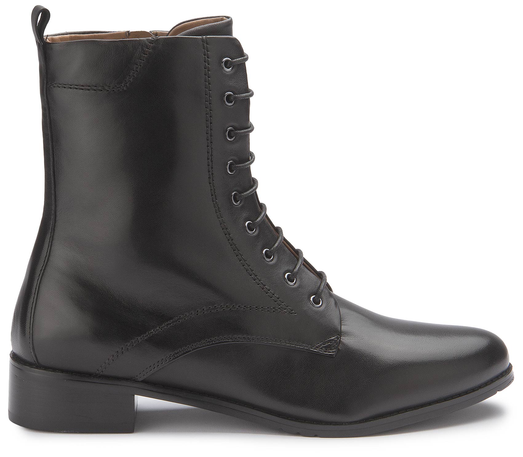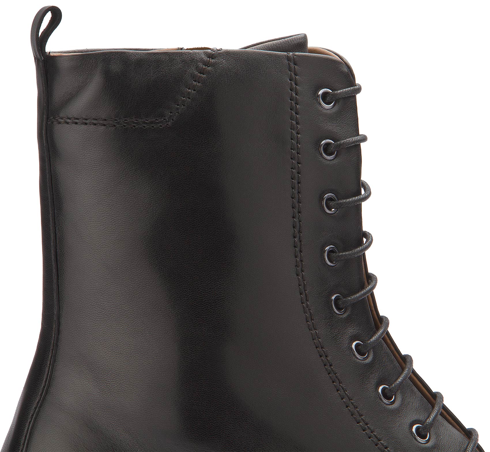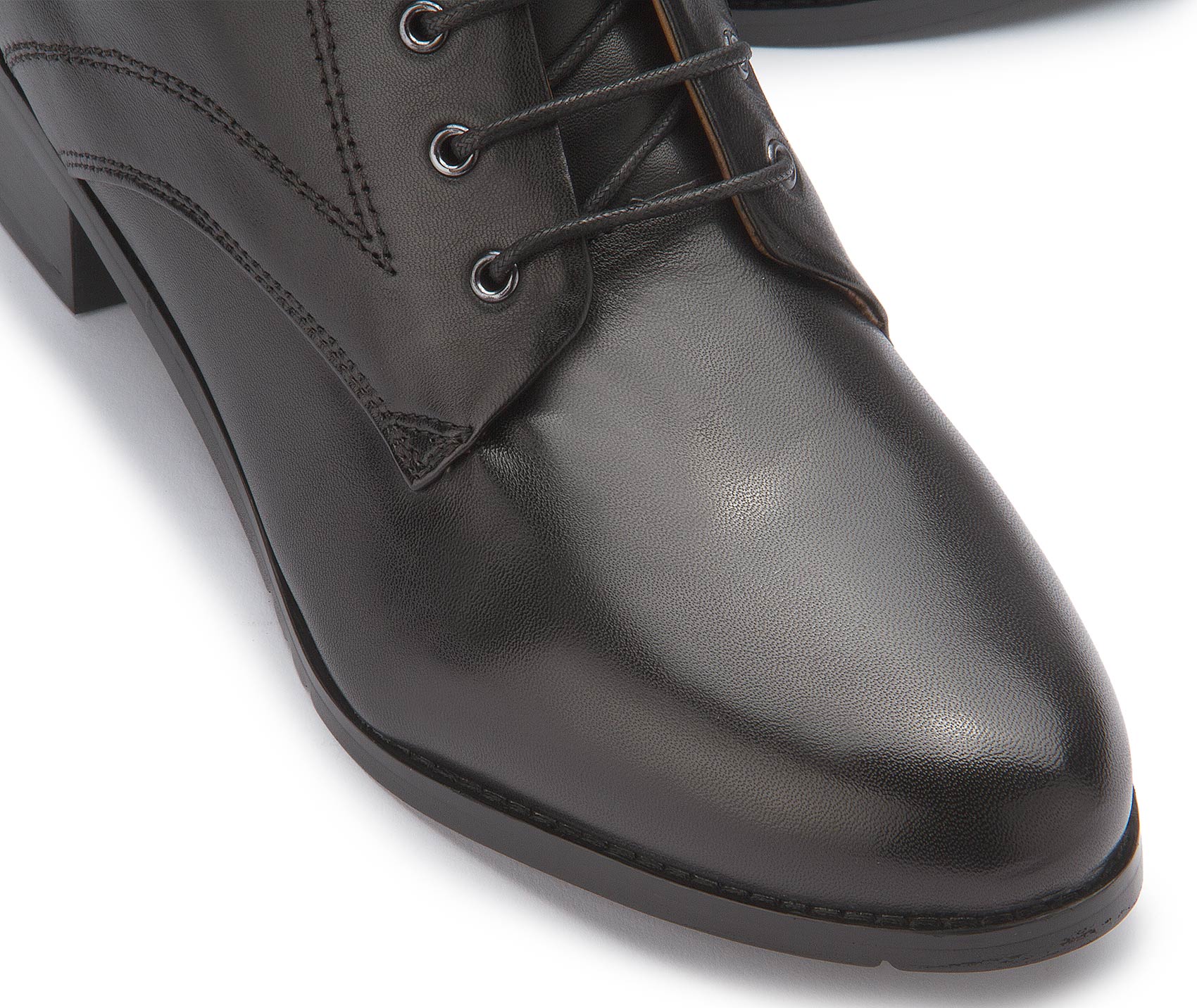 Diese eleganten Stiefeletten aus schwarzem Glattleder überzeugen mit einem zeitlosen Design. Die klassische Schnürung verleiht ihnen eine edle Note, während der seitliche Reißverschluss für bequemes An- und Ausziehen sorgt. Perfekt kombinierbar zu Business- und Freizeit-Looks.