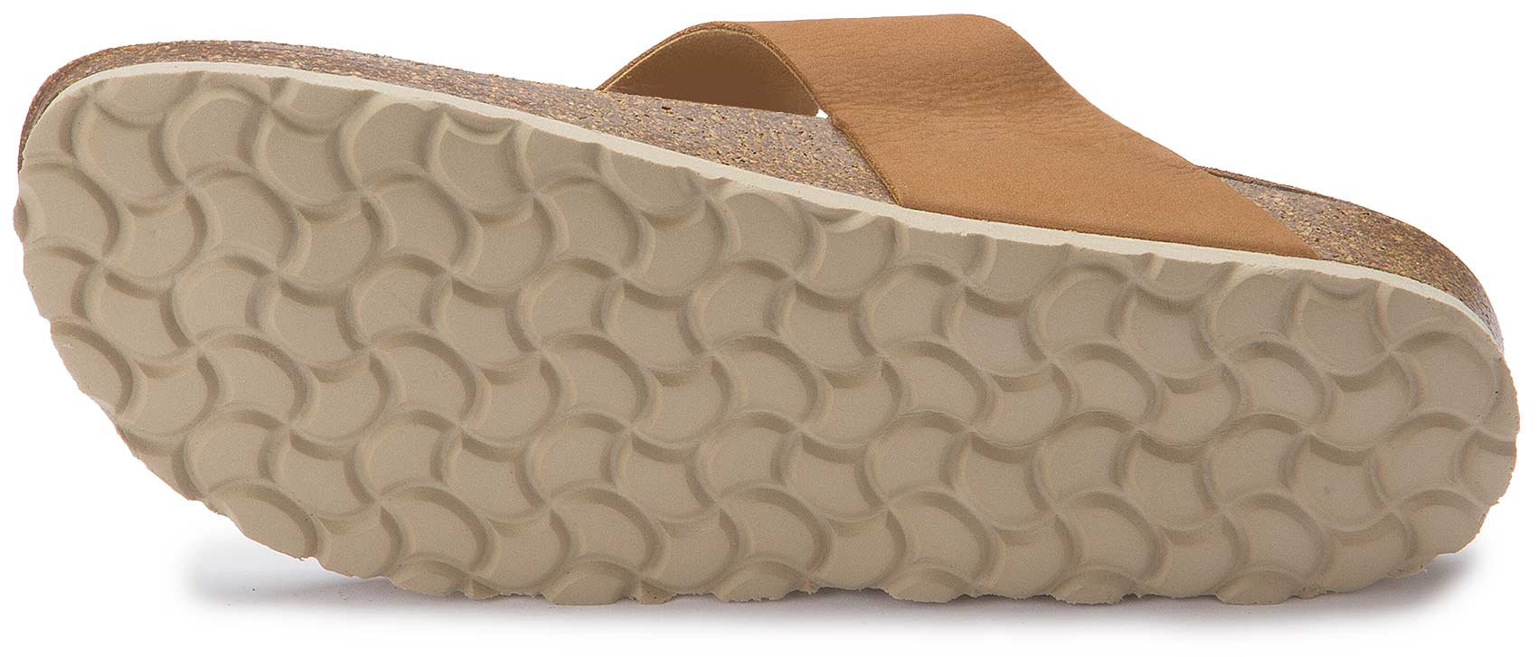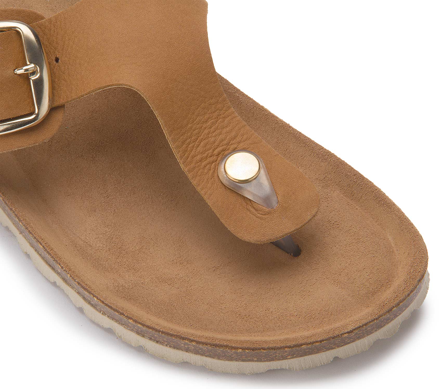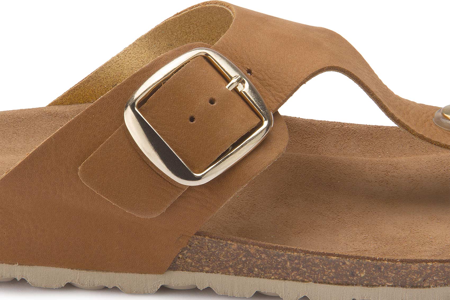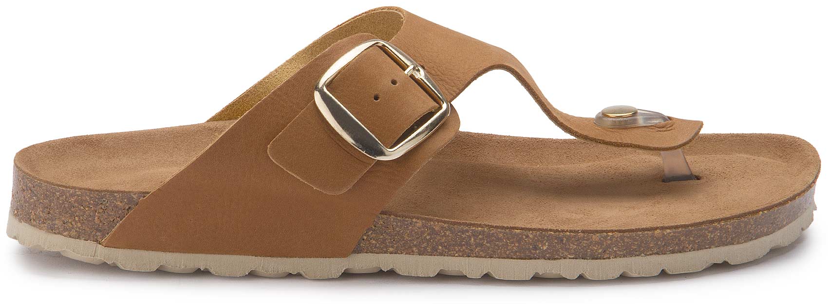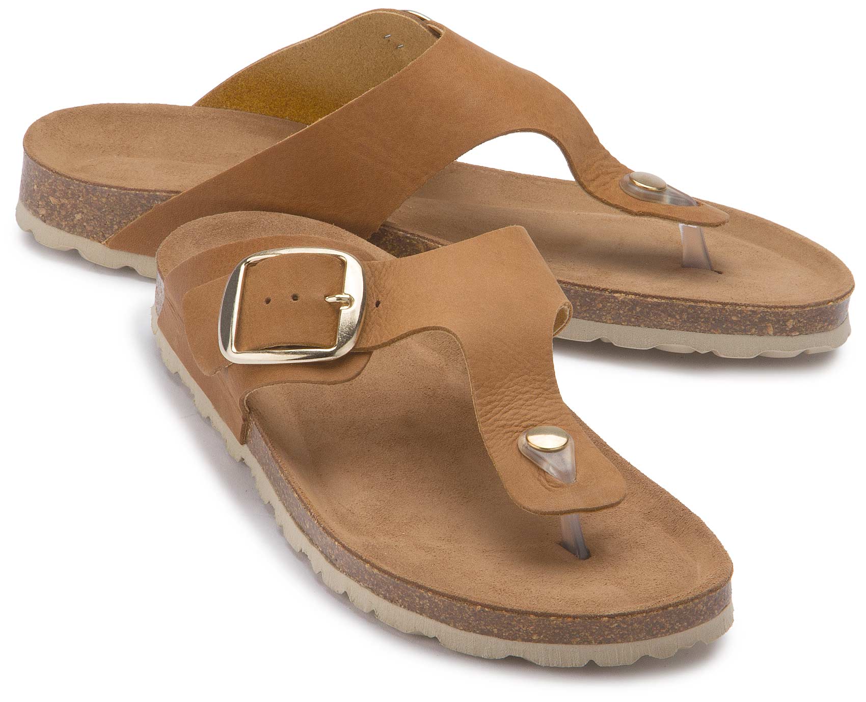 Der schlichte Zehentrenner von Bariello in elegantem Braun überzeugt mit einem hochwertigen Lederriemen und komfortabler Korksohle. Die ergonomisch geformte Fußbettung sowie der verstellbare Riemen mit goldfarbener Schnalle sorgen für optimalen Halt und angenehmen Tragekomfort. Ideal für warme Tage – stilvoll und bequem zugleich.