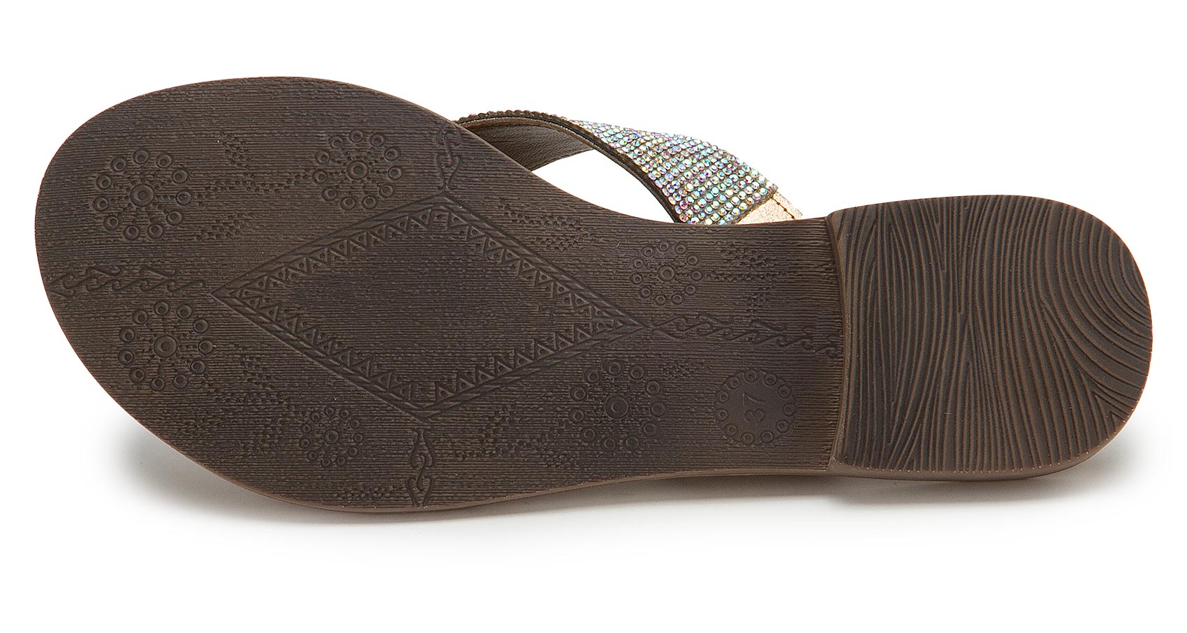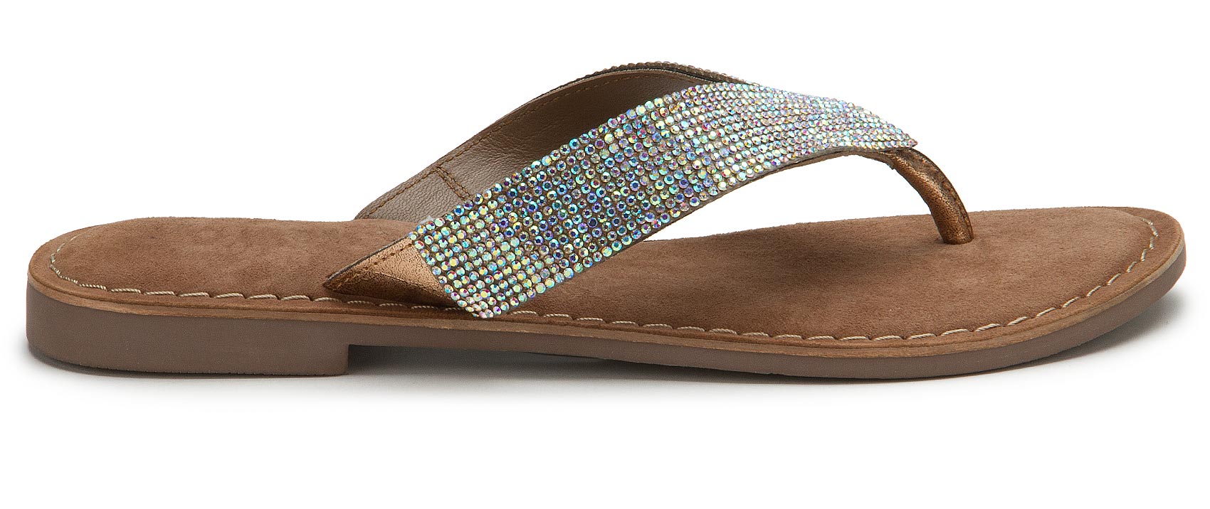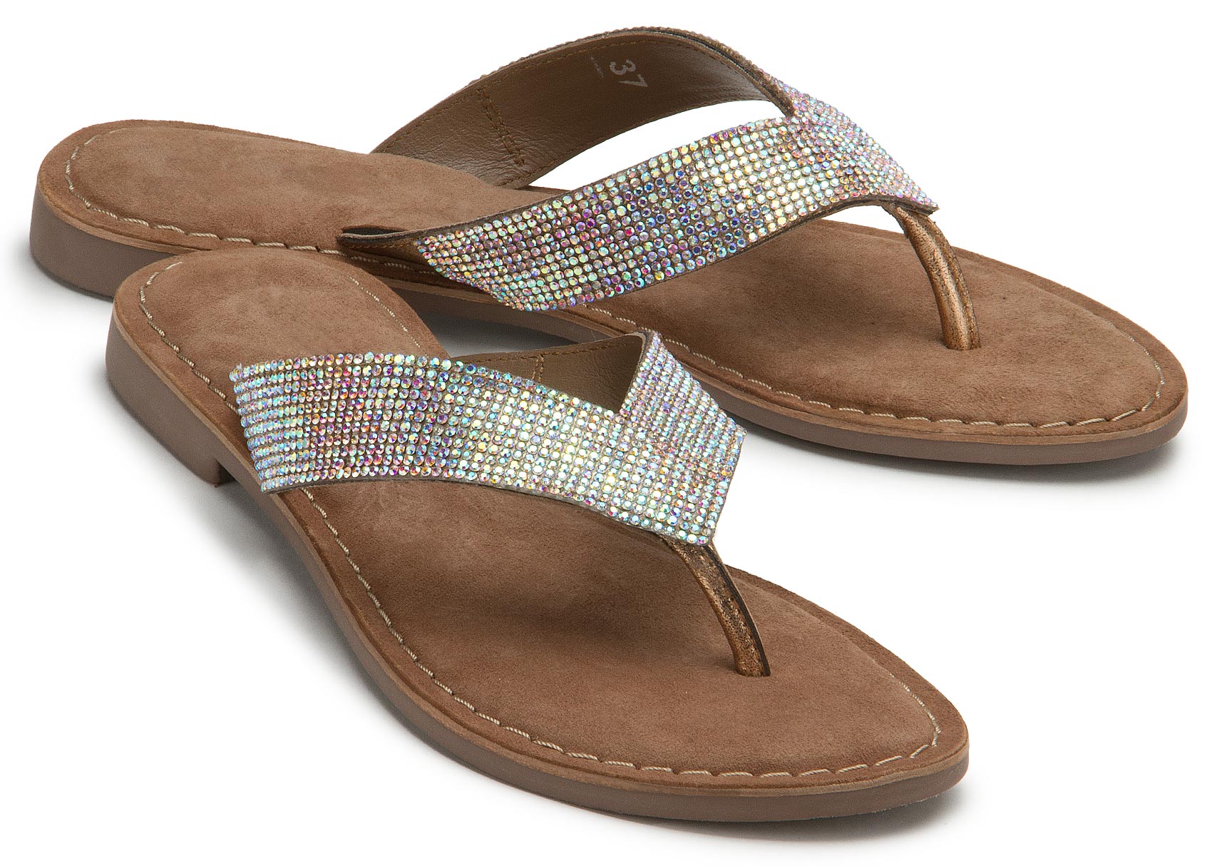Mit diesem Zehentrenner wird der Sommer einfach cool! Das Design mit den schimmernden Strassteinchen harmoniert perfekt mit luftigen Sommerkleidern als auch zu lässigen Jeans oder hippen Strandlooks toll kombinieren.